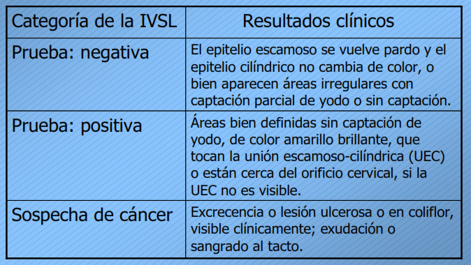 En este caso se procede a pintar todo el cuello uterino con una solución de Lugol y se clasifican los epitelios como: