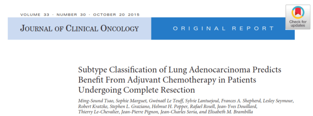 Purpose: The classification for invasive lung adenocarcinoma by the International Association for the Study of Lung Cancer, American Thoracic Society, European Respiratory Society, and WHO is based on the predominant histologic pattern-lepidic (LEP), papillary (PAP), acinar (ACN), micropapillary (MIP), or solid (SOL)-present in the tumor. This classification has not been tested in multi-institutional cohorts or clinical trials or tested for its predictive value regarding survival from adjuvant chemotherapy (ACT).