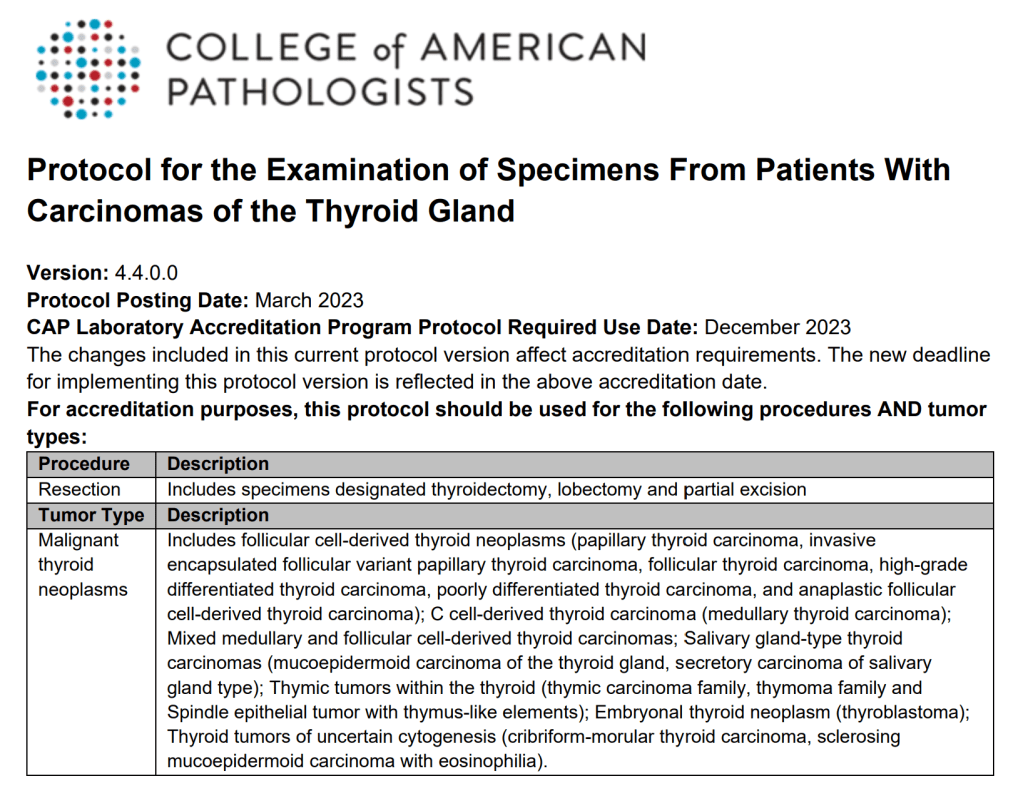 En marzo de 2023 el Colegio Americano de Patólogos actualizó su protocolo para informar los tumores de la Glándula Tiroides. Es la versión 4.4.0.0 y son sus principales diferencias con la anterior :